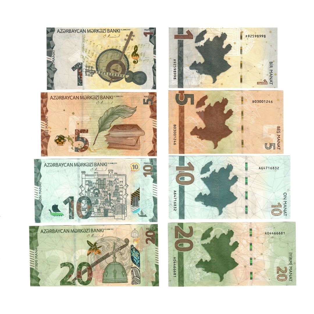 The set consists of 4 banknotes in denominations of 1, 5, 10, 20 Azerbaijani manats.