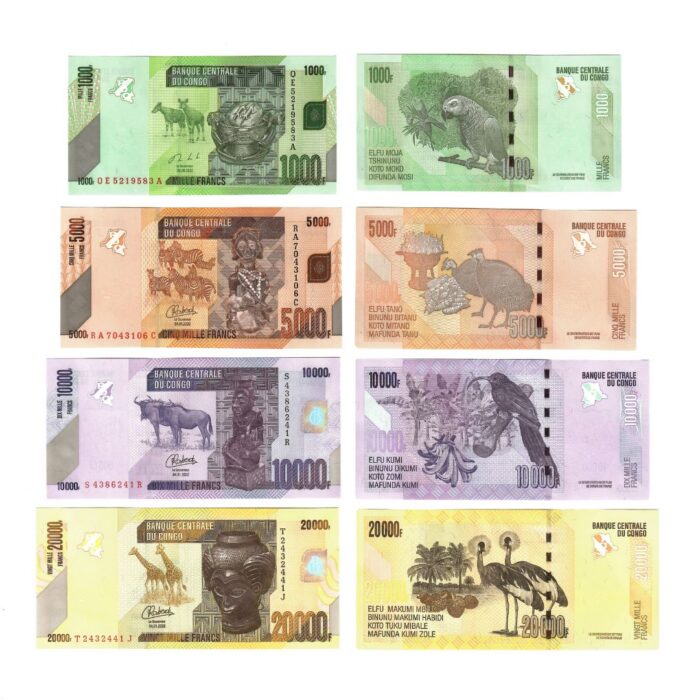 The set consists of 4 banknotes in denominations of 1000, 5000, 10,000, 20,000 Congolese francs.