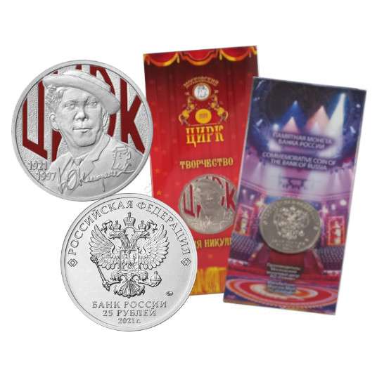 The obverse of the coin depicts a relief image of a portrait of Yuri Nikulin against the background of the inscription “CIRCUS”, below – an image of the artist’s autograph and the years of his life “1921” and “1997”. The reverse shows the State Emblem of the Russian Federation, the inscriptions “Russian Federation” and “Bank of Russia”, as well as the trademark of the Moscow Mint (on the right), the denomination of the coin and the year of issue.