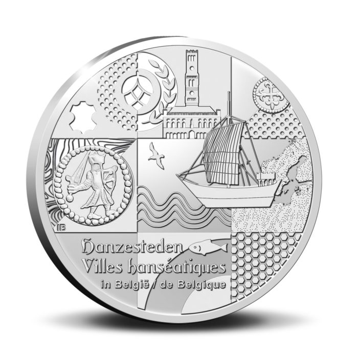 The obverse features a creative composition of visual elements that give the impression of what was transported and traded along the Hanseatic routes: leather and animal skins, hops, beer and wine, salt and spices, fish, grain and beeswax, wood and cloth. On the map depicting the Hanseatic region, a ship is sailing. A 13th century coin from Bruges symbolizes trade and merit. The symbol of the Bruges bell tower highlights the importance of the Belgian Hanseatic cities and the prosperity they brought.