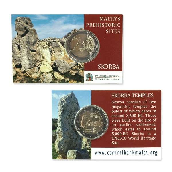 El anverso de la moneda conmemorativa de 2 euros representa las ruinas del complejo del templo de Skorba, situado en el noroeste de Malta. En la parte superior de la moneda está la inscripción «Skorba TEMPLES 3600-2500 BC», y en la parte inferior está el nombre del país» MALTA «y el año de emisión de la moneda»2020». También cerca hay una estatuilla de terracota que se encuentra en Skorba.