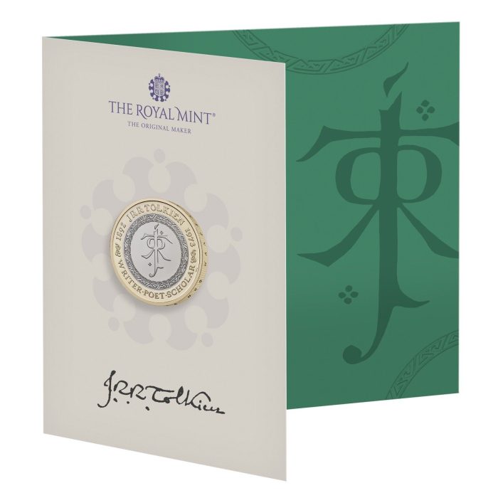 Junto con la inscripción «ESCRITOR • POETA • CIENTÍFICO», el reverso de la moneda muestra los años de nacimiento y muerte de J. R. R. Tolkien. El reverso de la moneda presenta el monograma único de Tolkien rodeado por un elaborado diseño rúnico. La inscripción en el borde de la moneda es «No todos los que deambulan están perdidos», una cita del poema de Tolkien «El acertijo del zancudo».