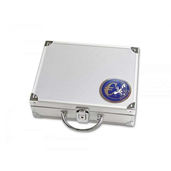 Cofre de aluminio para guardar 30 juegos completos de euros (de 1 céntimo a 2 euros) de todos los países europeos actuales y futuros, con pegatinas y banderas. Un lugar seguro y económico para guardar tu colección de monedas de euro sin cápsulas. Fabricado en una carcasa de aluminio con esquinas y bordes reforzados, con una elegante asa, que se puede cerrar con dos llaves incluidas. En el interior hay 6 bandejas con revestimiento de terciopelo azul y una barra para facilitar la extracción de las bandejas. Muescas redondas.