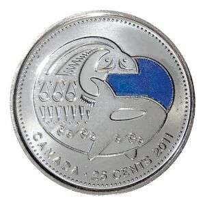 El anverso representa una orca contra un círculo azul que simboliza el océano. El texto en la parte inferior dice «CANADÁ», la denominación es «25 CENTAVOS» y el año de emisión es «2011». El reverso muestra a Su Majestad la Reina Isabel II de perfil, rodeada por la inscripción en latín «ELIZABETH II DG REGINA».