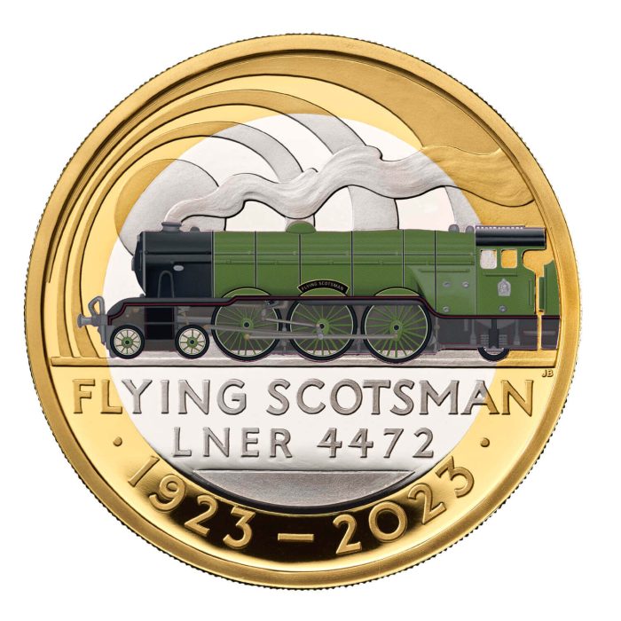 Moneda de plata 2 libras Gran Bretaña 2023 – 100 aniversario de la locomotora a vapor «Flying Scotsman»