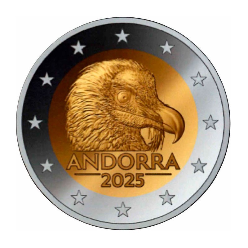 Andorran vuoden 2025 2 euron erikoiskolikossa on kuvattuna yksi Pyreneiden harvinaisimmista ja majesteettisimmista asukkaista – hanhikorppikotka. Yksityiskohtainen kuva korostaa tämän petolinnun ainutlaatuisuutta, ja itse kolikon liikkeeseenlasku symboloi maan sitoutumista ympäristönsuojeluun.