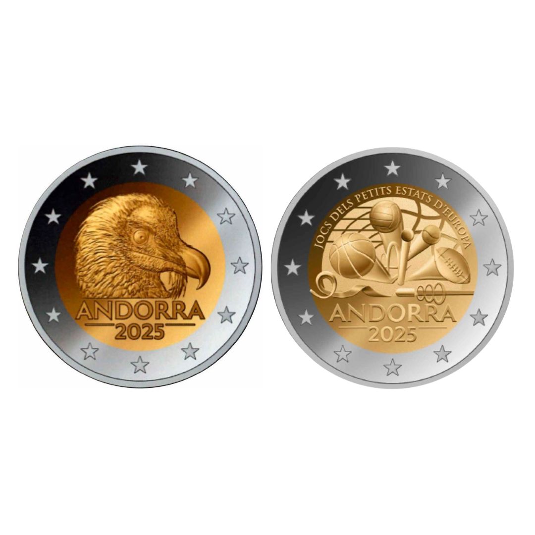 Andorran toinen kahden euron erikoisraha, vuoden 2025 kolikko, on omistettu Euroopan pienten valtioiden kisoille, yhdelle alueen merkittävimmistä urheilutapahtumista. Dynaaminen ulkoasu, jossa on symboleja eri lajeista, välittää kilpailun energiaa ja osallistujamaiden välistä yhtenäisyyden henkeä.