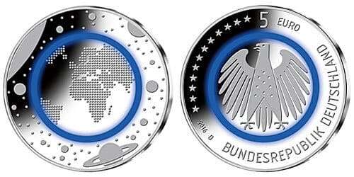 La moneta è composta da 3 componenti: un anello esterno, un disco interno in lega di rame-nichel e un anello polimerico blu conduttivo. Iscrizione sul bordo: BLAUER PLANET ERDE. Rovescio: centro – contorni dei continenti della Terra, sull’anello esterno – immagini dei pianeti del sistema solare. Il dritto della moneta raffigura un’aquila tedesca, anno di emissione, denominazione, nome del paese e 12 stelle dell’Unione Europea.