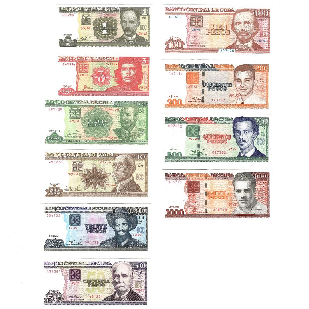 Il set è composto da 10 banconote nei tagli da 1, 3, 5, 10, 20, 50, 100, 200, 500, 1000 pesos cubani.