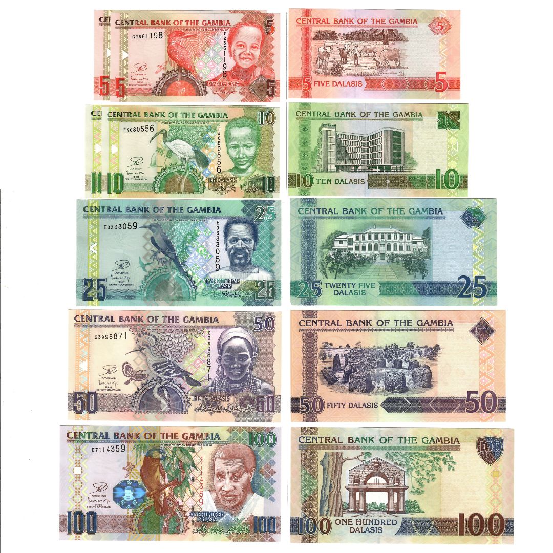 Il set è composto da 5 banconote nei tagli da 5, 10, 25, 50, 100 dalasi gambiani.