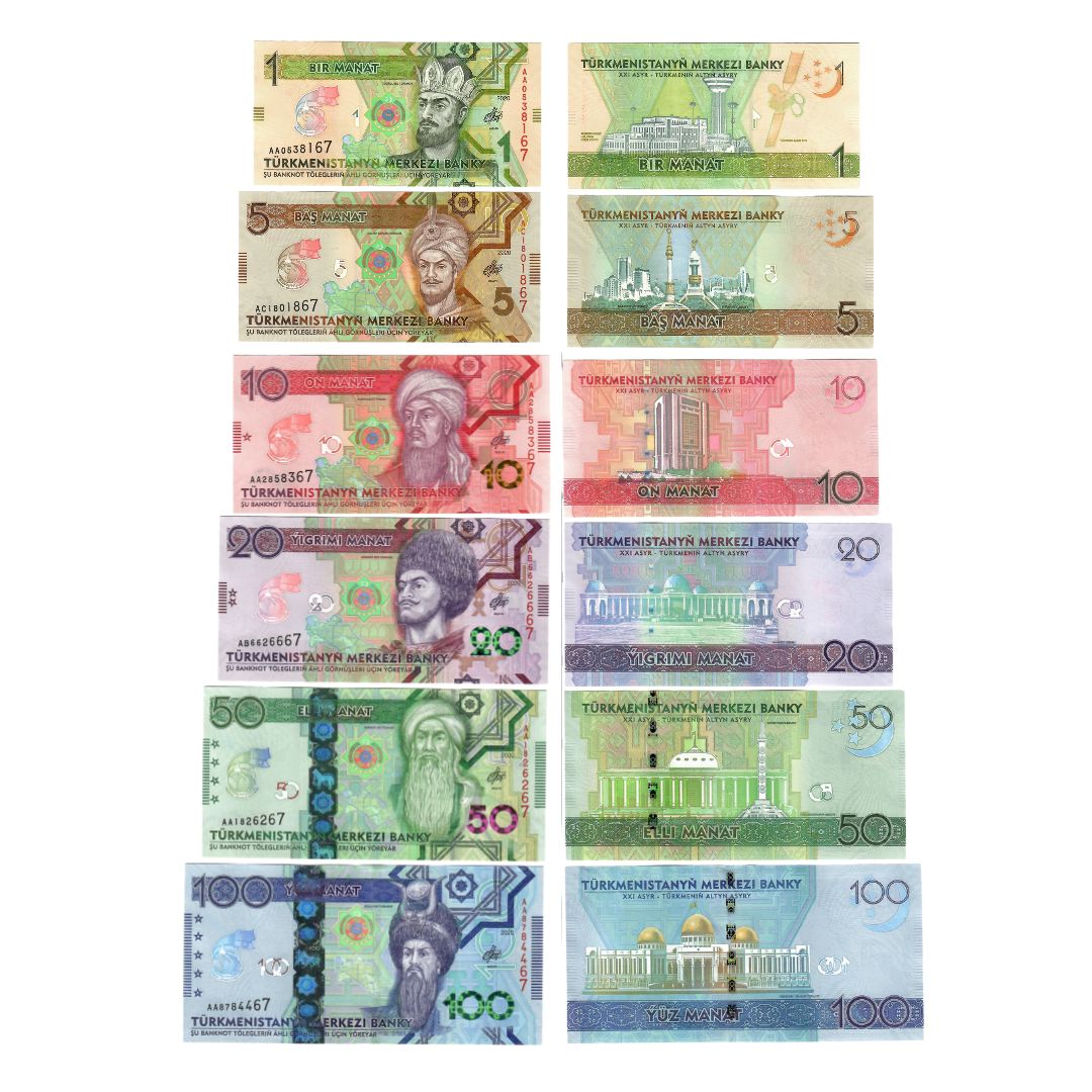 Il set è composto da 6 banconote nei tagli da 1, 5, 10, 20, 50, 100 manat turkmeni.