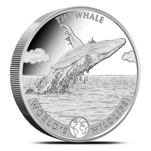 Al contrario la moneta d’argento raffigura una balenottera azzurra che salta. Didascalie: “LA BALENA” e “LA VITA SELVAGGIA DEL MONDO” e l’immagine del pianeta Terra.