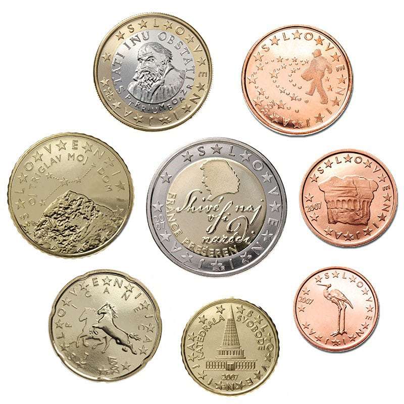 Si compone di otto monete di diverse denominazioni: 2 euro, 1 euro, nonché 50, 20, 10, 5, 2, 1 centesimi. L’euro in Slovenia è entrato in circolazione il 1 ° gennaio 2007.