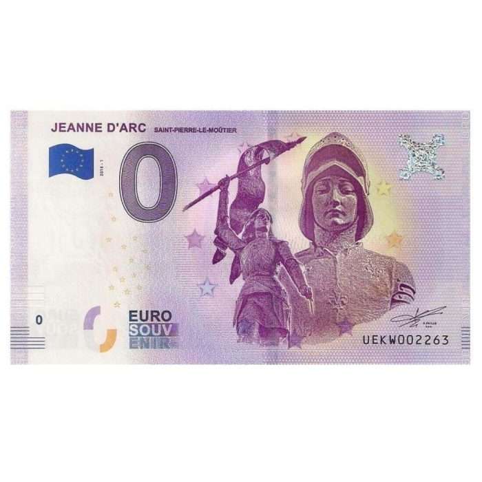 На лицевой стороне банкноты находится Жанна д’Арк, Орлеанская дева — национальная героиня Франции, одна из командующих французскими войсками в Столетней войне. Попав в плен к бургундцам, была передана англичанам, осуждена как еретичка и сожжена на костре.