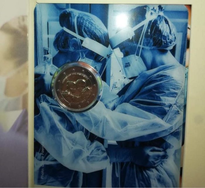 Монеты были отчеканены в Монне де Пари во Франции и отмечены его знаком. Лицевая сторона монеты была разработана и выгравирована Марией Анной Фризоне. Она изображает двух медицинских работников, готовящихся к встрече с неизвестным. На реверсе монеты изображена стандартная сторона номиналом 2 евро.