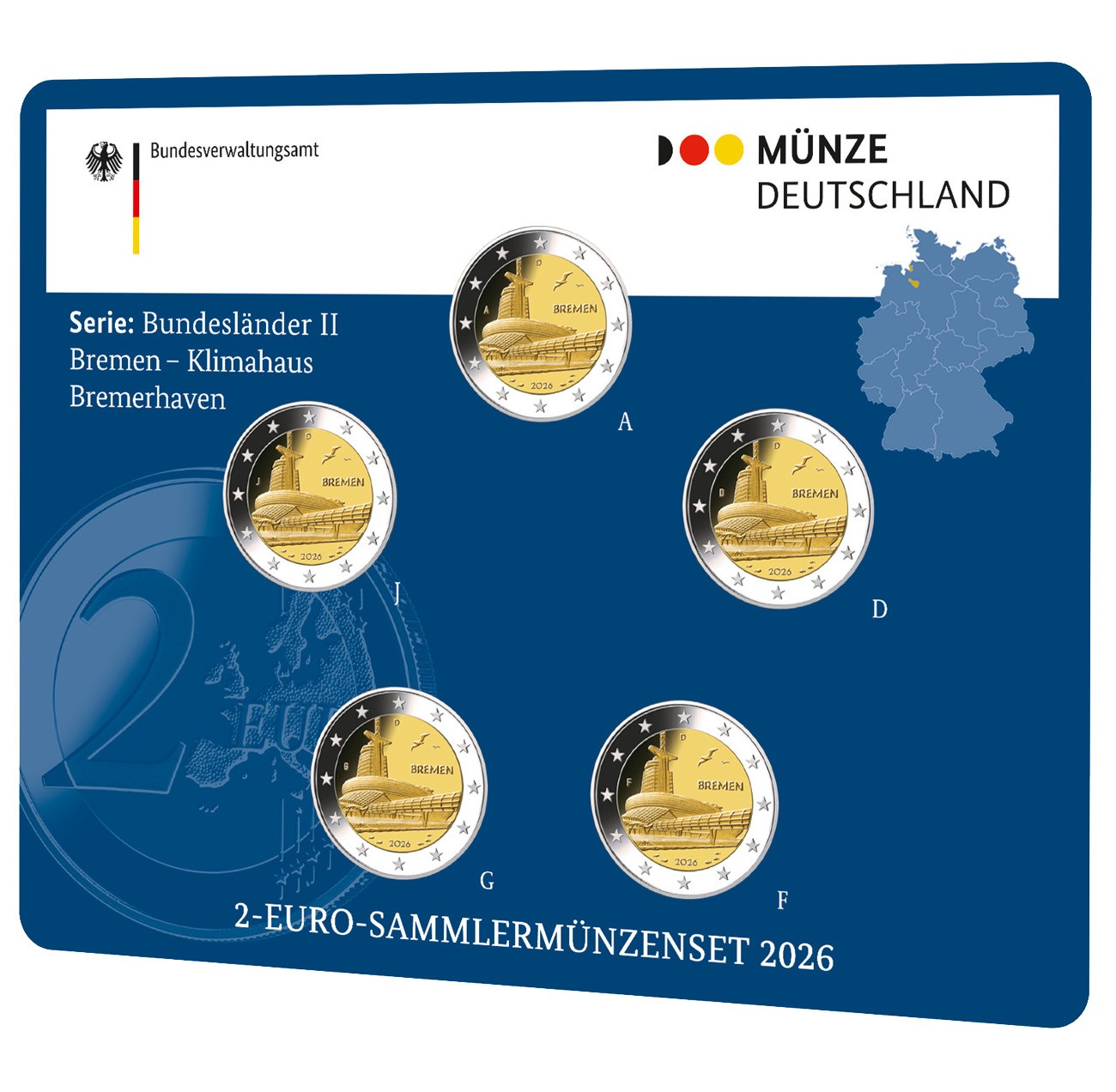 See mündikomplekt on pühendatud Bremenile ja Bremerhaveni kliimamajale ning kuulub seeriasse “Bundesländer”. Mündil on kujutatud arhitektuurilisi ja merenduslikke elemente, mis illustreerivad Bremeni rolli mereäärse teaduskeskusena.
