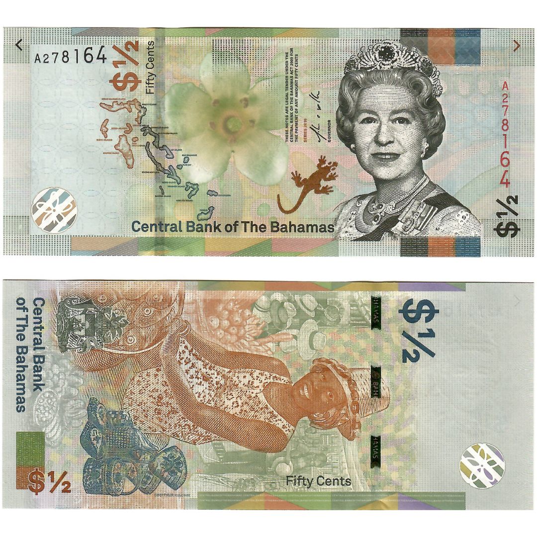 Esiküljel on kuninganna Elizabeth II portree, saarestiku kaart ja kohaliku taimestiku ja loomastiku kujutised, samuti kiri “Bahama keskpank” ja nimiväärtus “½ dollarit”.