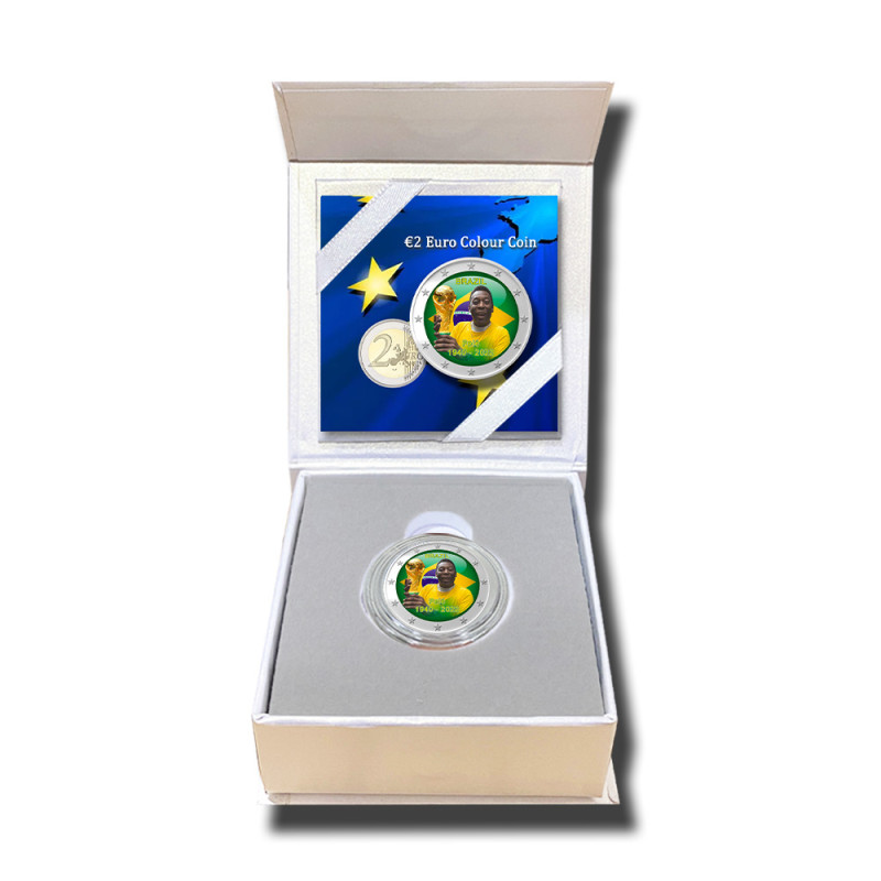 2-eurone kogumismünt, mis on pühendatud “jalgpallikuningale” – Peléle. Üks jalgpalli tähtsamaid nimesid, keda tuntakse kogu maailmas. Ta sai kuulsaks oma uskumatu kiiruse, jäljendamatu tehnika, võimsa löögi ja väravavaistu kombinatsiooni poolest. Pelét peetakse õigustatult üheks viljakamaks mängijaks jalgpalliajaloos, olles oma karjääri jooksul löönud üle tuhande värava.