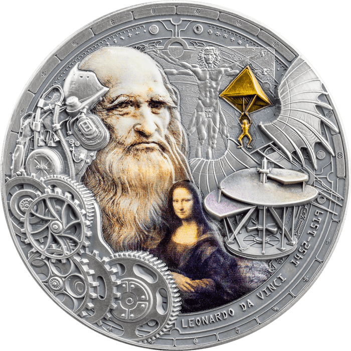 Mineviku futuristide seeria teine münt on pühendatud Leonardo da Vincile, renessansiajastu geeniusele, kelle uuenduslikud kujundused ja arenenud kontseptsioonid realiseerusid alles sajandeid pärast tema surma. Kogu maailmas tunnustatud Leonardo kui kunstniku, teadlase, leiutaja ja mõtleja erakordne panus ületas kujuteldamatust palju. Da Vinci futurismi juured olid tema pühendumises uuendustele ja tema usule, et teadus ja tehnoloogia võivad maailma muuta.